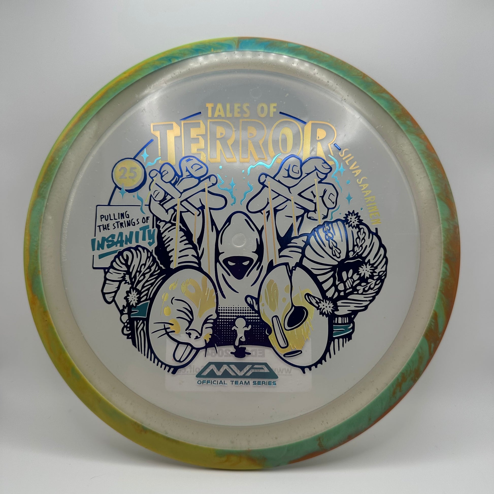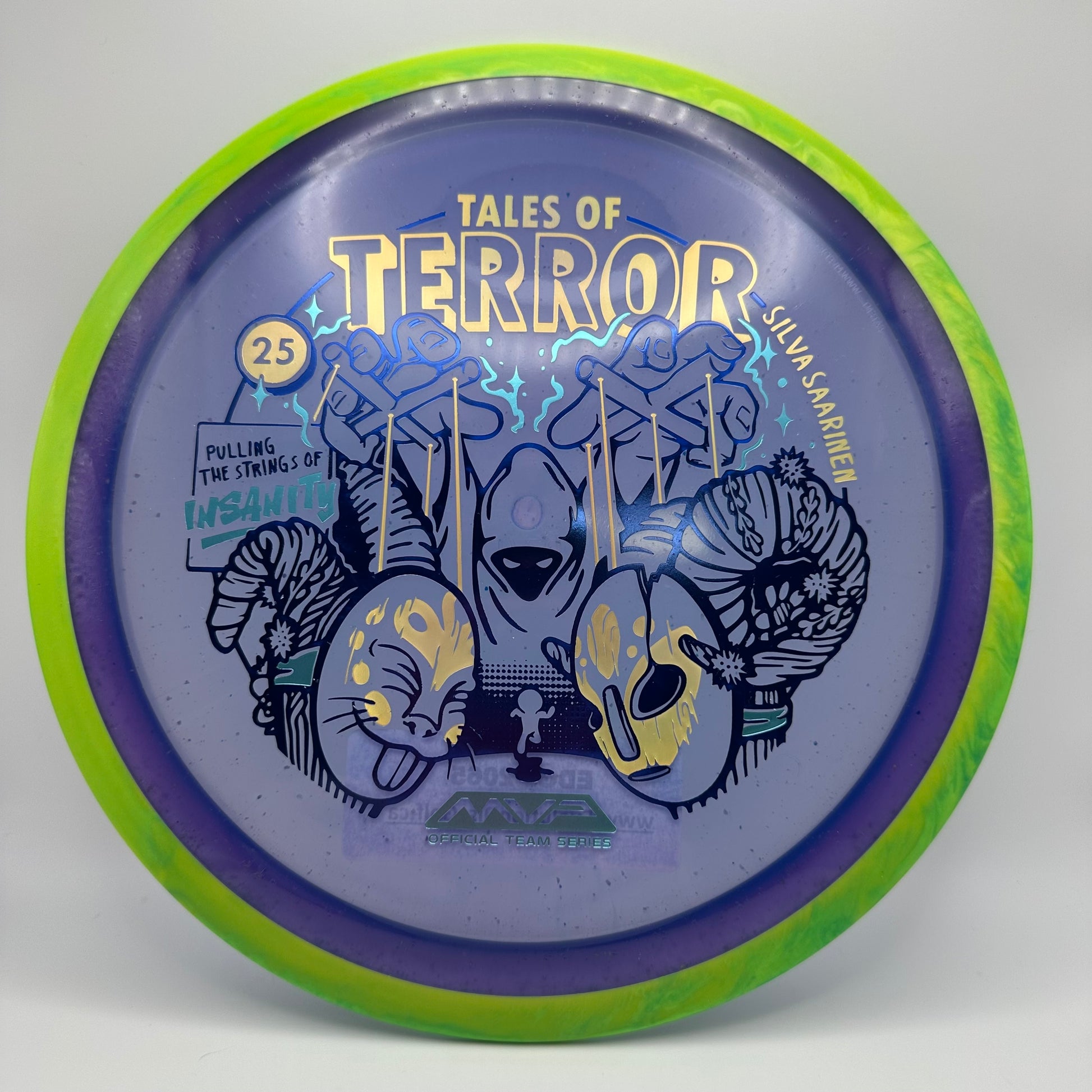 Silva Saarinen 2025 Halloween Special Edition: Beware the one pulling the strings during the Finnish Harvest Festival! Stamp newcomer Damian White unveils his first MVP stamp for this Halloween comic inspired design on the Particle Proton Insanity, a warning that some ornaments created for this event are a bit more ghoulish than they appear. The Insanity is a stable-understable driver that players will find easy to manipulate, with average power throws being remarkably straight with forward pushing fade, and higher power throws resulting in precise hyzer-flips, turnovers, and beautiful s-lines. Don’t let the course pull your strings - grab a Particle Proton Insanity today and prove who the true master is.