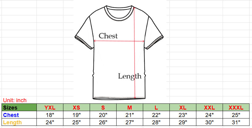 - Sizes Available: YXL/XS/S/M/L/XL/XXL/XXL
